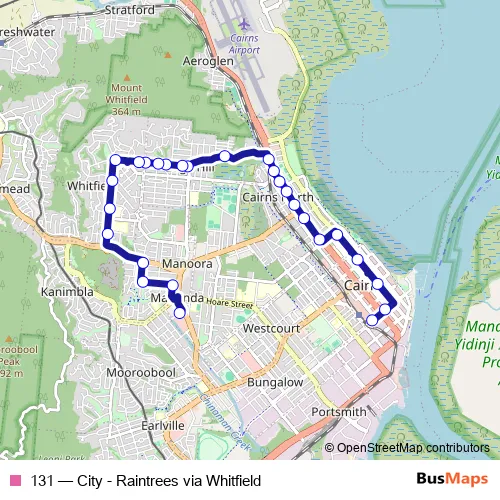 The first stop of the 131 bus route is Cairns Central Shopping Centre (Spence St) and the last stop is Raintrees Shopping Centre Stop B. 131 (City - Raintrees via Whitfield) is operational during todos los días.