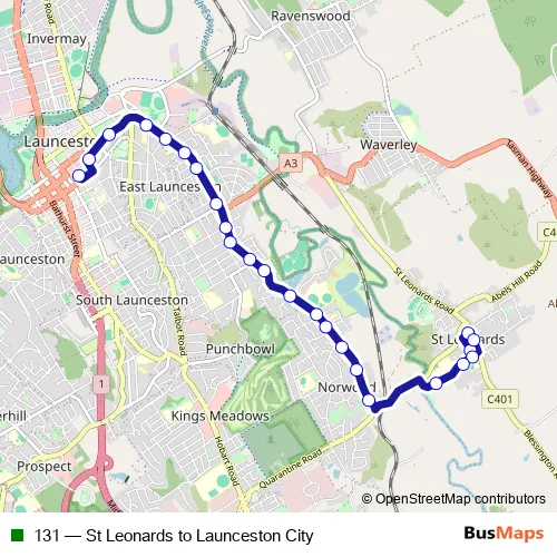 The first stop of the 131 bus route is Kertch Rd after Station Rd and the last stop is Launceston Interchange, St John St opp Quadrant Mall. 131 (St Leonards to Launceston City) is operational during entre semana.