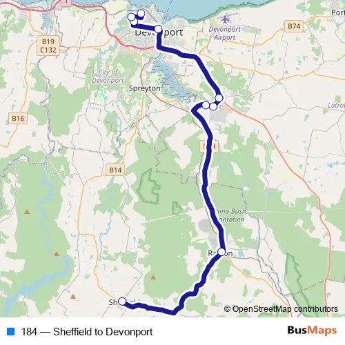The first stop of the 184 bus route is Sheffield, High St before Main St and the last stop is St Brendan-Shaw College, James St. 184 (Sheffield to Devonport) is operational during todos los días.