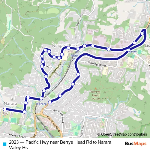 The first stop of the 2023 bus route is Pacific Hwy Opp Berrys Head Rd and the last stop is Narara Valley High School, Fountains Rd. 2023 (Pacific Hwy near Berrys Head Rd to Narara Valley Hs) is operational during entre semana.