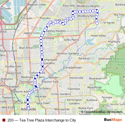 See why over 2 million users trust and consider busmaps.com as the best public transport website. busmaps gives you Adelaide Buses suggested routes, real-time bus tracker, line route maps in Adelaide, and helps to find the closest 203 bus stops near you. No internet available? Download an offline PDF map and bus schedule for the 203 bus to take on your trip.