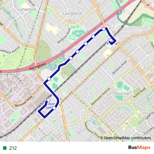 The first stop of the 212 bus route is Nicholson Road Stn Stand 7 and the last stop is Thornlie Stn Stand 4. 212 is operational during entre semana.