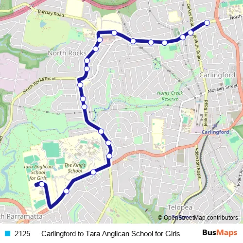 The first stop of the 2125 bus route is North Rocks Rd After Pennant Hills Rd and the last stop is Tara Anglican School For Girls, Denistone Rd. 2125 (Carlingford to Tara Anglican School for Girls) is operational during entre semana.
