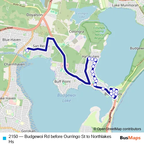 Bus 2150 - Budgewoi Rd before Ourringo St to Northlakes Hs in Budgewoi: Stops & Timetable