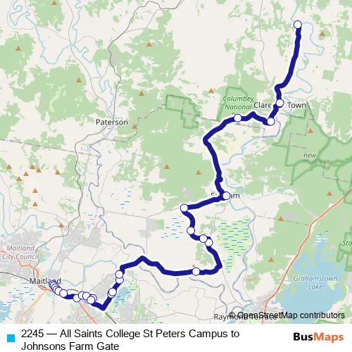 The first stop of the 2245 bus route is St Peters Maitland, High St and the last stop is Glen William Rd Opp Pine Brush Rd. 2245 (All Saints College St Peters Campus to Johnsons Farm Gate) is operational during entre semana.