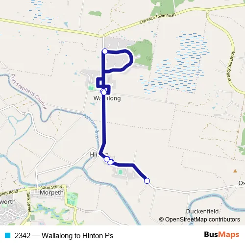 The first stop of the 2342 bus route is High St At Morpeth St and the last stop is Hinton Public School, Paterson St. 2342 (Wallalong to Hinton Ps) is operational during entre semana.