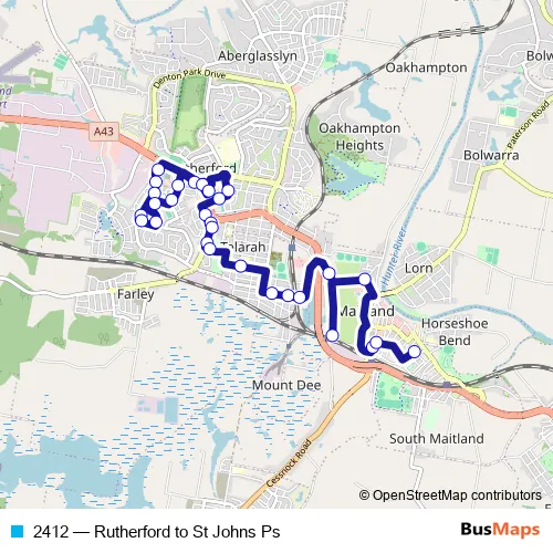 The first stop of the 2412 bus route is New England Hwy Opp Alexandra Av and the last stop is St John The Baptist Primary School, Victoria St. 2412 (Rutherford to St Johns Ps) is operational during entre semana.