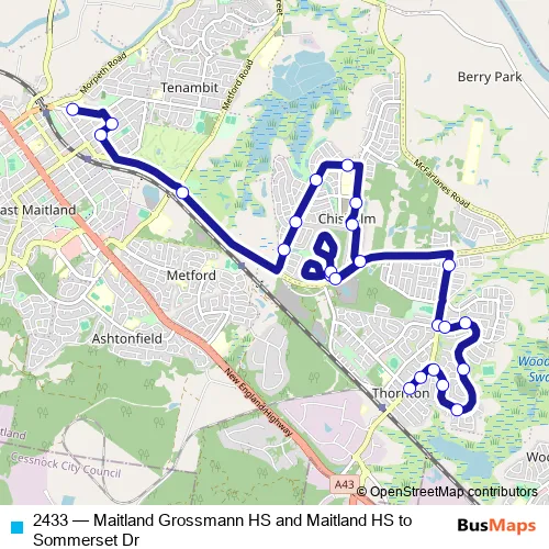 The first stop of the 2433 bus route is Maitland Grossmann High School, Cumberland St and the last stop is Edwards Av At Eurimbla St. 2433 (Maitland Grossmann HS and Maitland HS to Sommerset Dr) is operational during entre semana.
