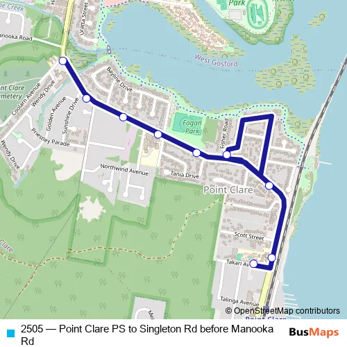 The first stop of the 2505 bus route is Point Clare Public School, Takari Av and the last stop is Point Clare Ambulance Service, Brisbane Water Dr. 2505 (Point Clare PS to Singleton Rd before Manooka Rd) is operational during entre semana.