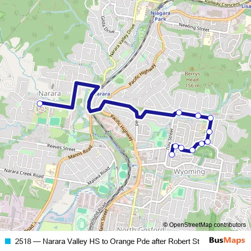 The first stop of the 2518 bus route is Narara Valley High School, Fountains Rd and the last stop is Orange Pde Before Opala Av. 2518 (Narara Valley HS to Orange Pde after Robert St) is operational during entre semana.