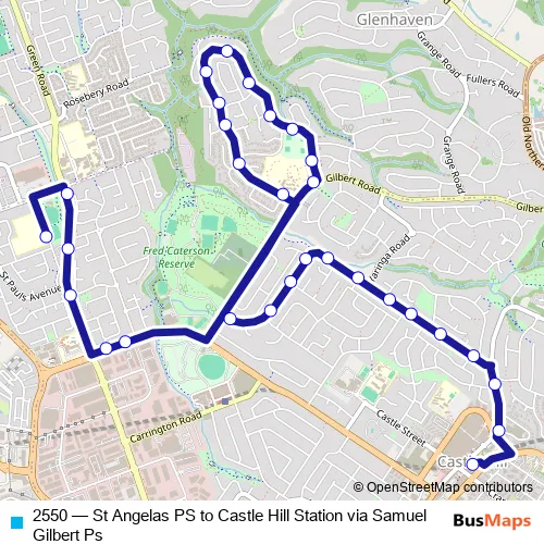 The first stop of the 2550 bus route is St Angela's Primary School, Harrington Av and the last stop is Castle Hill Station, Old Northern Rd, Stand D. 2550 (St Angelas PS to Castle Hill Station via Samuel Gilbert Ps) is operational during entre semana.