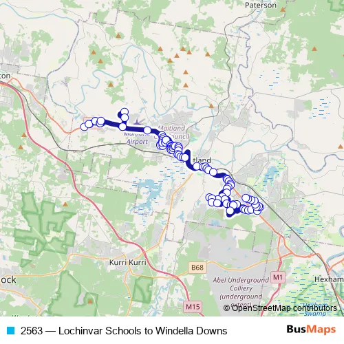 The first stop of the 2563 bus route is New England Hwy Opp Lochinvar Public School and the last stop is Chelmsford Dr Opp Tennyson St. 2563 (Lochinvar Schools to Windella Downs) is operational during entre semana.