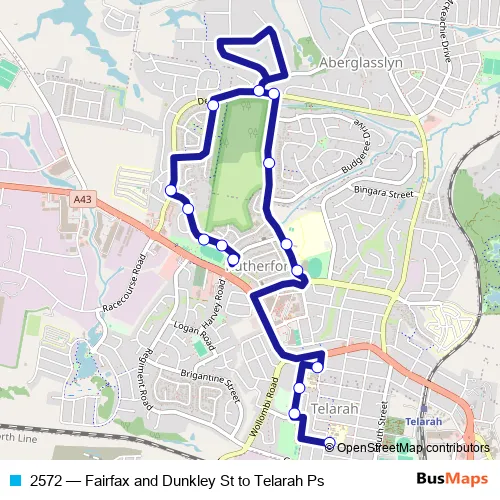 The first stop of the 2572 bus route is Norm Chapman Oval, Dunkley St and the last stop is Telarah Public School, Raymond St. 2572 (Fairfax and Dunkley St to Telarah Ps) is operational during entre semana.