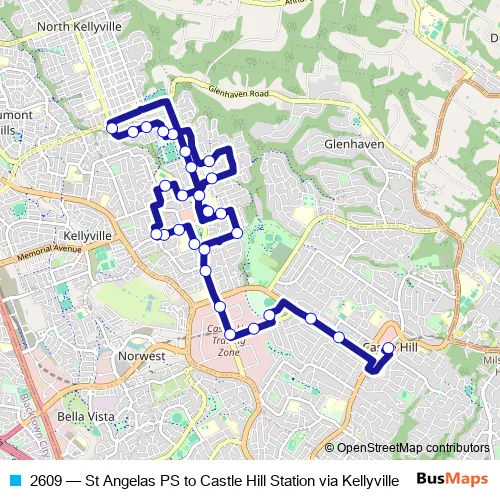 The first stop of the 2609 bus route is St Angela's Primary School, Harrington Av and the last stop is Castle Hill Station, Old Northern Rd, Stand B. 2609 (St Angelas PS to Castle Hill Station via Kellyville) is operational during entre semana.