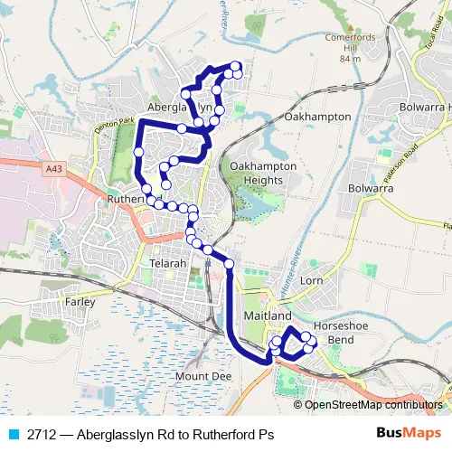The first stop of the 2712 bus route is Rutherford Technology High School, Avery St and the last stop is Maitland Public School, Olive St. 2712 (Aberglasslyn Rd to Rutherford Ps) is operational during entre semana.