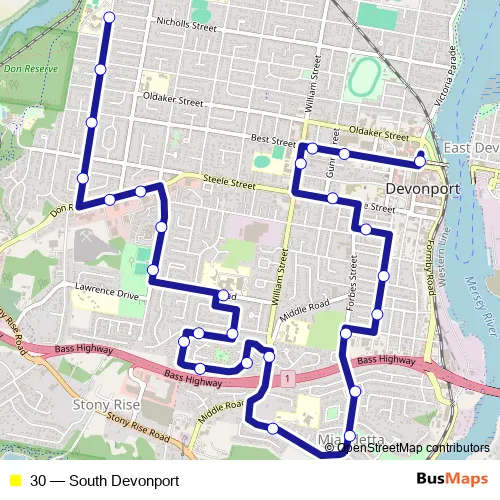 The first stop of the 30 bus route is Rooke Street (Interchange Stop-A) and the last stop is 87-121 Watkinson Street (Don College). 30 (South Devonport) is operational during entre semana.