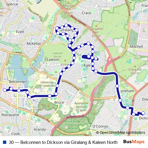 Bus 30 - Belconnen to Dickson via Giralang & Kaleen North in Canberra: Stops & Timetable