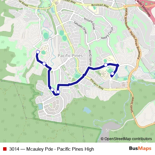 The first stop of the 3014 bus route is Mcauley Pde near Matthews Dr and the last stop is Pacific Pines High School. 3014 (Mcauley Pde - Pacific Pines High) is operational during entre semana.