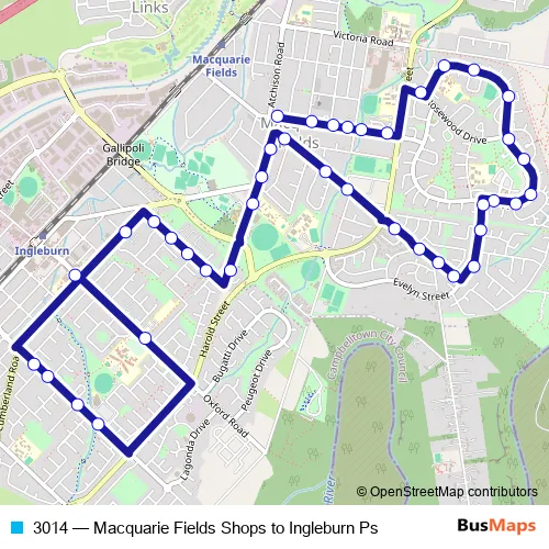 The first stop of the 3014 bus route is Parliament Rd After Atchison Rd and the last stop is Ingleburn Public School, Oxford St. 3014 (Macquarie Fields Shops to Ingleburn Ps) is operational during entre semana.
