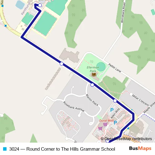 The first stop of the 3024 bus route is Round Corner Shops, Old Northern Rd and the last stop is Hills Grammar School Bus Bay. 3024 (Round Corner to The Hills Grammar School) is operational during entre semana.