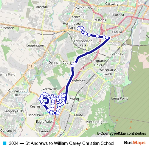 The first stop of the 3024 bus route is Ballantrae Dr After Blairgowrie Cct and the last stop is William Carey Christian School, School Grounds. 3024 (St Andrews to William Carey Christian School) is operational during entre semana.