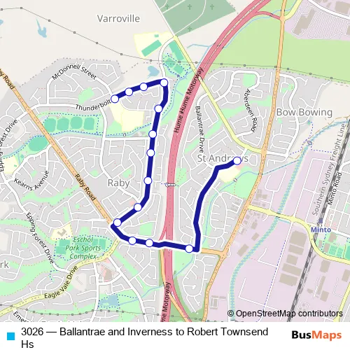 The first stop of the 3026 bus route is Ballantrae Dr After Blairgowrie Cct and the last stop is Robert Townson High School, Thunderbolt Dr. 3026 (Ballantrae and Inverness to Robert Townsend Hs) is operational during entre semana.
