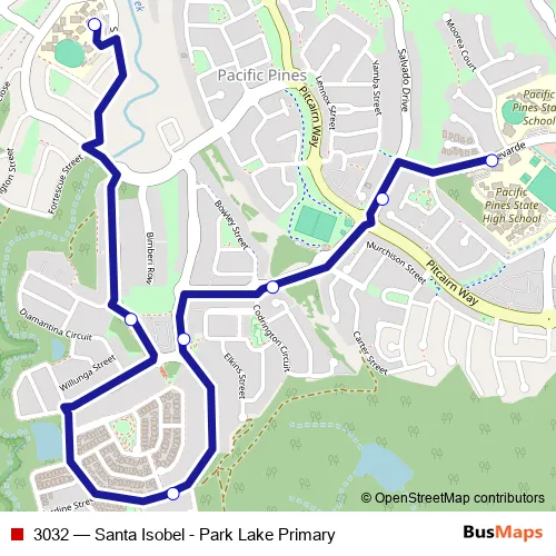 The first stop of the 3032 bus route is Santa Isobel Bvd near Amanu Cr and the last stop is Park Lake Primary School. 3032 (Santa Isobel - Park Lake Primary) is operational during entre semana.