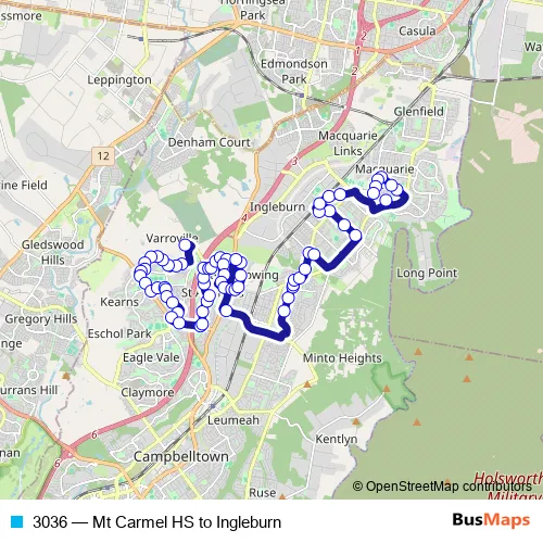 The first stop of the 3036 bus route is Mount Carmel High School, School Grounds and the last stop is Macquarie Fields Public School, Fields Rd. 3036 (Mt Carmel HS to Ingleburn) is operational during entre semana.