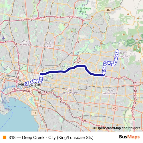 The first stop of the 318 bus route is King St/Lonsdale St and the last stop is Deep Creek Reserve/Heidelberg-Warrandyte Rd. 318 (Deep Creek - City (King/Lonsdale Sts)) is operational during entre semana.