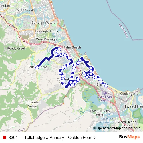 The first stop of the 3304 bus route is Tallebudgera Primary School and the last stop is Golden Four Dr at George Street. 3304 (Tallebudgera Primary - Golden Four Dr) is operational during entre semana.