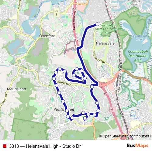 The first stop of the 3313 bus route is Helensvale State High School and the last stop is Studio Dr near Village Way. 3313 (Helensvale High - Studio Dr) is operational during entre semana.