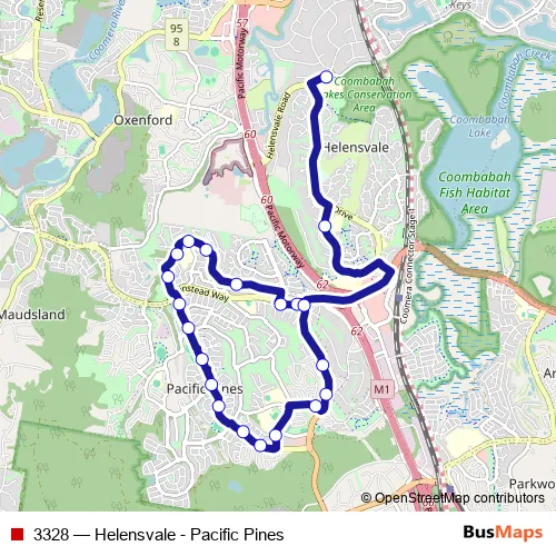 The first stop of the 3328 bus route is Helensvale State High School and the last stop is Pacific Pines Bvd near Capricorn Dr. 3328 (Helensvale - Pacific Pines) is operational during entre semana.