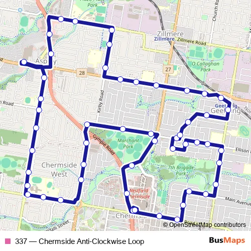 The first stop of the 337 bus route is Chermside Shopping Centre interchange C and the last stop is Chermside interchange. 337 (Chermside Anti-Clockwise Loop) is operational during todos los días.