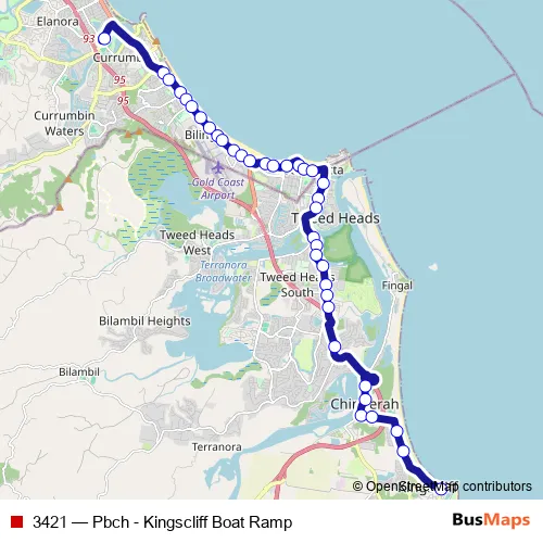 The first stop of the 3421 bus route is Palm Beach Currumbin State High School and the last stop is Marine Pde near Faulks Park. 3421 (Pbch - Kingscliff Boat Ramp) is operational during entre semana.