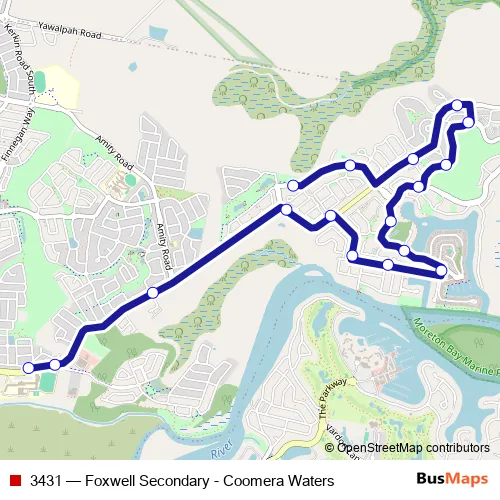 The first stop of the 3431 bus route is Foxwell Rd at Foxwell State Secondary College and the last stop is Ragamuffin Dr near Ratu Lane hail 'n' ride. 3431 (Foxwell Secondary - Coomera Waters) is operational during entre semana.