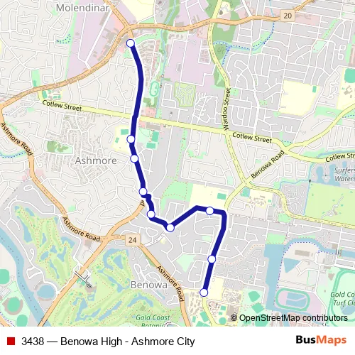 The first stop of the 3438 bus route is Benowa Rd at Benowa State High School and the last stop is