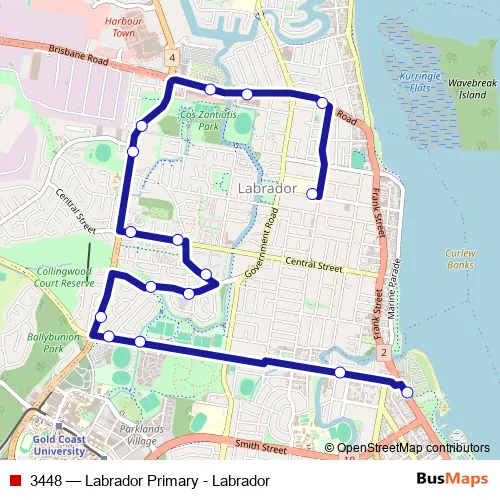 The first stop of the 3448 bus route is Imperial Pde near Turpin Rd and the last stop is Gold Coast Hwy at Broadwater Tourist Park. 3448 (Labrador Primary - Labrador) is operational during entre semana.