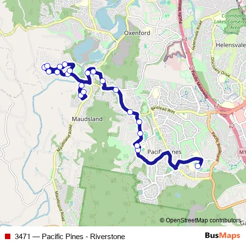 The first stop of the 3471 bus route is Pacific Pines High School and the last stop is Rivermill Tce near Settlers Ave hail 'n' ride. 3471 (Pacific Pines - Riverstone) is operational during entre semana.