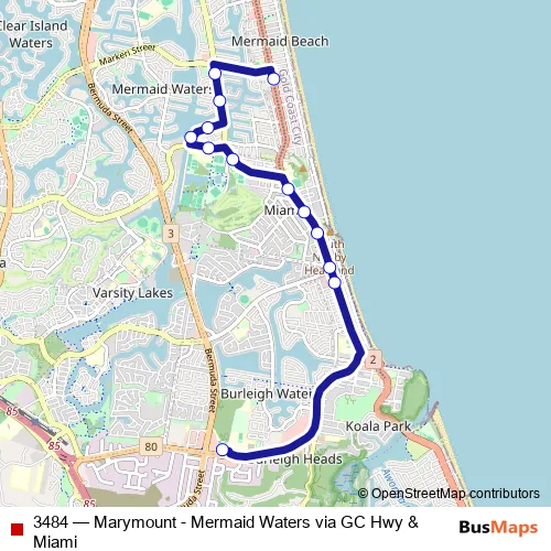 The first stop of the 3484 bus route is Marymount College and the last stop is Tamborine Street. 3484 (Marymount - Mermaid Waters via GC Hwy & Miami) is operational during entre semana.