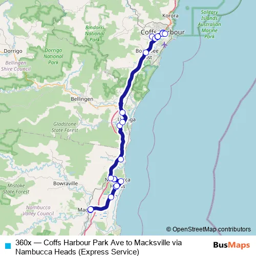 Click here to view the nearest 360x - Coffs Harbour Park Ave to Macksville via Nambucca Heads (Express Service) bus stop.