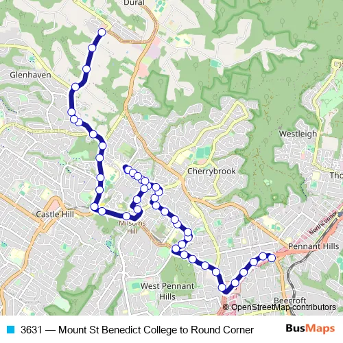 The first stop of the 3631 bus route is Beecroft Rd Before Pennant Hills Rd and the last stop is Round Corner Shops, Old Northern Rd. 3631 (Mount St Benedict College to Round Corner) is operational during entre semana.