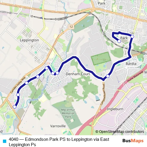 The first stop of the 4040 bus route is Edmondson Park Public School and the last stop is Emerald Hills Bvd After Jadeite St. 4040 (Edmondson Park PS to Leppington via East Leppington Ps) is operational during entre semana.