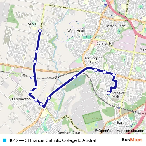 The first stop of the 4042 bus route is St Francis Catholic College, School Grounds and the last stop is Edmondson Av Before Hopkins Pl. 4042 (St Francis Catholic College to Austral) is operational during entre semana.