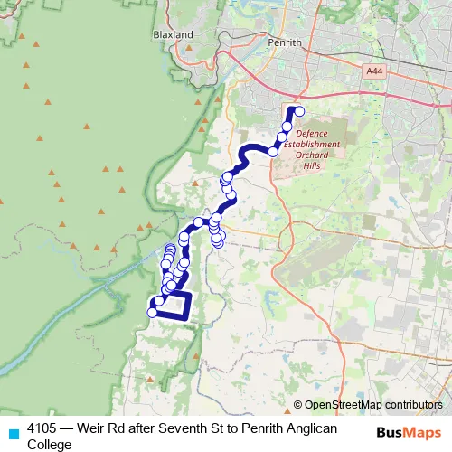 The first stop of the 4105 bus route is Weir Rd Opp Seventh St and the last stop is Cross Rd Penrith Anglican College. 4105 (Weir Rd after Seventh St to Penrith Anglican College) is operational during entre semana.