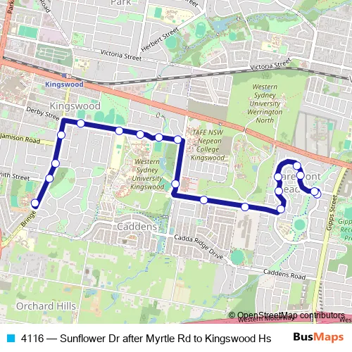 The first stop of the 4116 bus route is Myrtle Rd Before Sunflower Dr and the last stop is Kingswood High School, Bringelly Rd. 4116 (Sunflower Dr after Myrtle Rd to Kingswood Hs) is operational during entre semana.