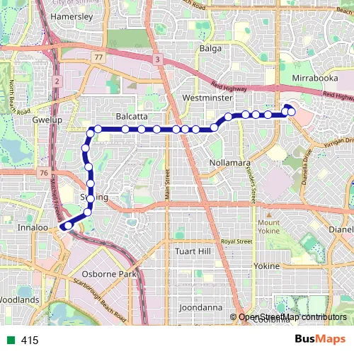 See why over 2 million users trust and consider busmaps.com as the best public transport website. busmaps gives you Perth Buses suggested routes, real-time bus tracker, line route maps in Perth, and helps to find the closest 415 bus stops near you. No internet available? Download an offline PDF map and bus schedule for the 415 bus to take on your trip.