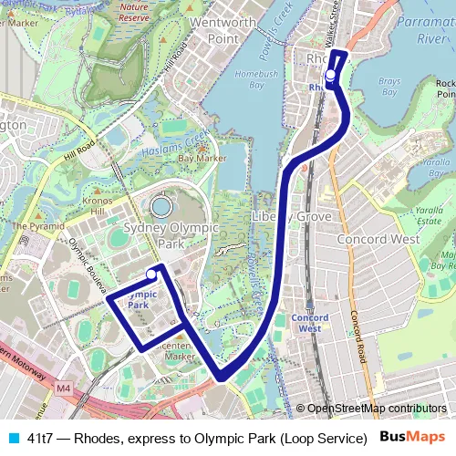 Blaxland Rd Opp Rhodes Station (Trackwork). 41t7 (Rhodes, express to Olympic Park (Loop Service)) is operational during todos los días.