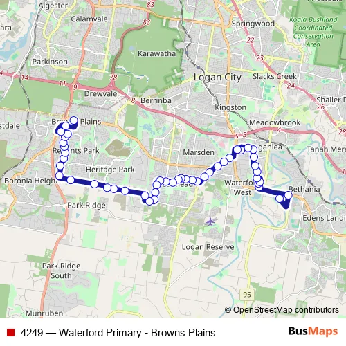 The first stop of the 4249 bus route is Waterford State Primary and the last stop is Browns Plains station, stop 1b. 4249 (Waterford Primary - Browns Plains) is operational during entre semana.