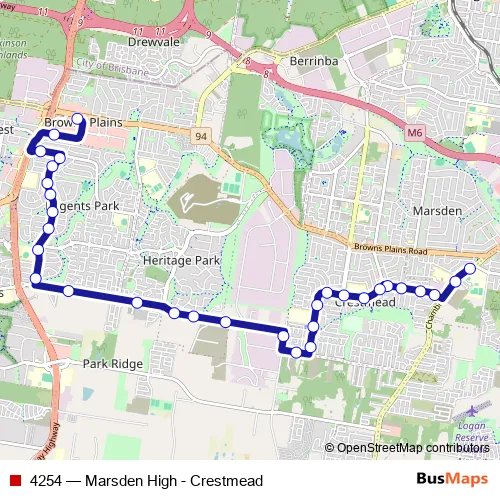 The first stop of the 4254 bus route is Chambers Flat Rd at Marsden High School and the last stop is Browns Plains station, stop 1b. 4254 (Marsden High - Crestmead) is operational during entre semana.