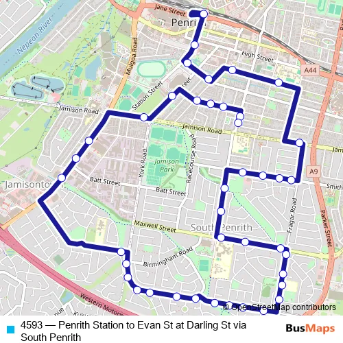 The first stop of the 4593 bus route is Penrith Station, Stand D and the last stop is Evan St At Darling St. 4593 (Penrith Station to Evan St at Darling St via South Penrith) is operational during entre semana.